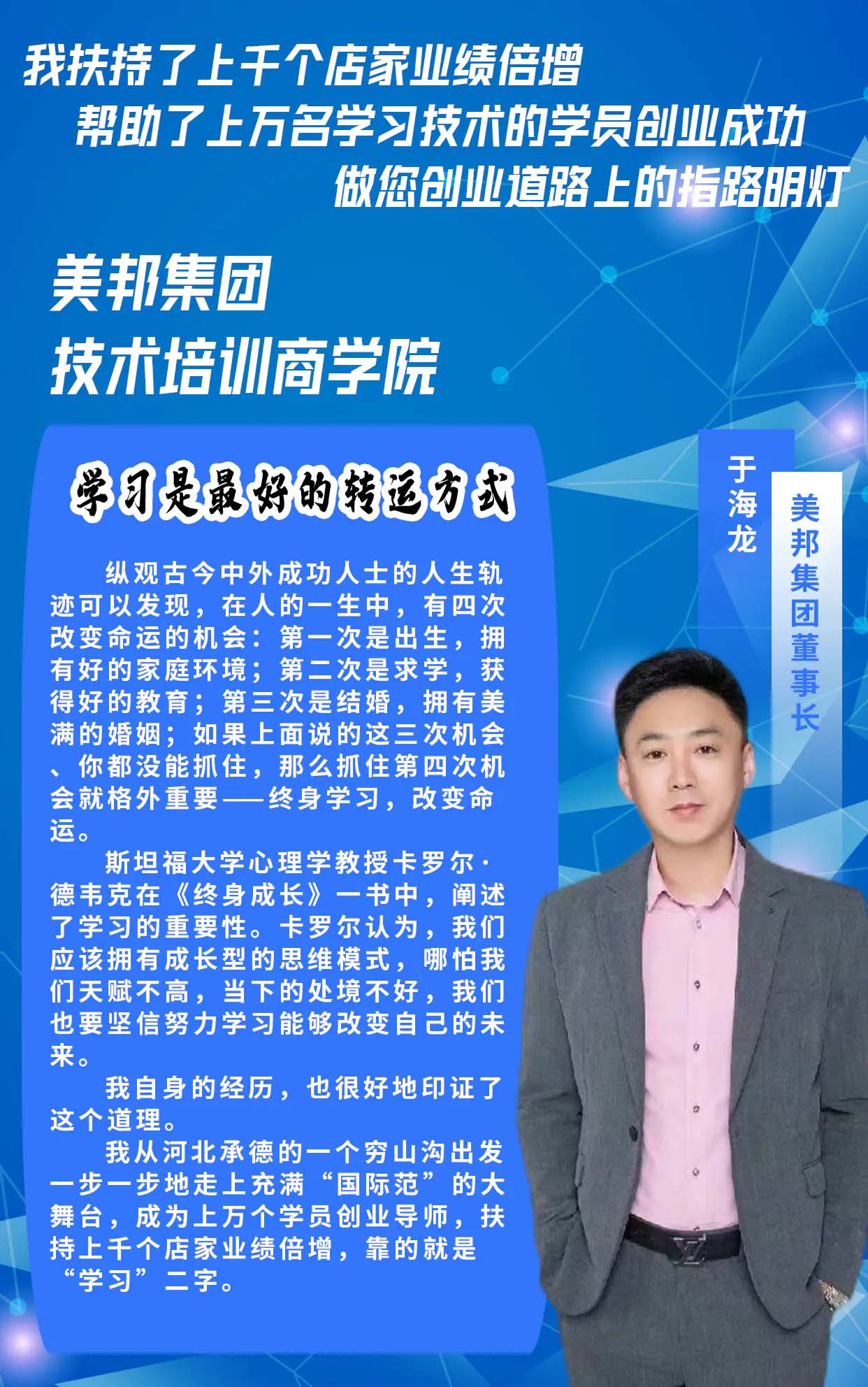 1、美邦技术培训商学院,国内正规的培训机构,拥有先进的技术,和大型的产品研发中心,国内加盟商1000多家,公司成功把千余名学员培训成头疗养发专家,因为专一,所以专业。